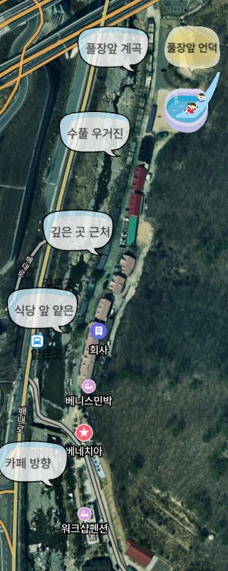 - 깊은물 근처 계곡가 : 어른 키만큼의 깊이있는 곳이 있습니다. 초등학교 고학년 이상이면 대체로 이 곳을 선호합니다. 어린이풀장과는 꽤 거리가 있습니다.(약 100m ). 식당이 가까운 쪽입니다. 젊은 층, 물놀이를 즐기는 성인층이 선호합니다만, 많은 사람들이 모이므로 주말과 성수기에는 많이 복잡합니다. (거의 테이블과 의자로 구성됩니다. 4인 테이블은 6인당 1개 정도로 배치됩니다. 테이블에 바퀴가 있기 때문에 테이블을 밀고 돗자리를 까셔도 좋습니다.)