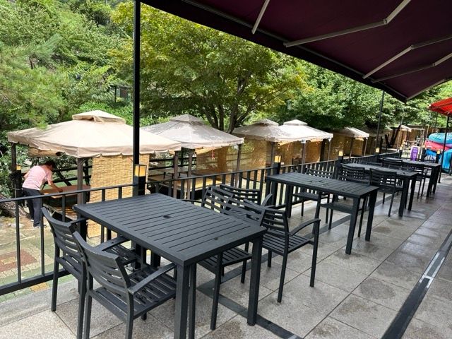 - 수풀우거진 곳 계곡가: 평상 지붕 위로 큰 나무가 있어서 이중으로 햇빛이 막아져서 조금 더 시원한 편입니다. 나이든 어르신들을 모시면 선호할 수 있는 위치입니다. 깊은 물 근처와 어린이풀장 가운데에 위치합니다. (반대로 말하면 이 자리는 깊은물도 어린이풀장도 둘 다 어중간하게 가깝지 않다고 말할 수도 있습니다, (거의 테이블과 의자로 구성됩니다. 4인 테이블은 평상 넓이 때문에 6인당 1개 정도로 배치됩니다. 테이블을 밀고 돗자리를 까셔도 좋습니다. 깊은물 1분 도보거리)