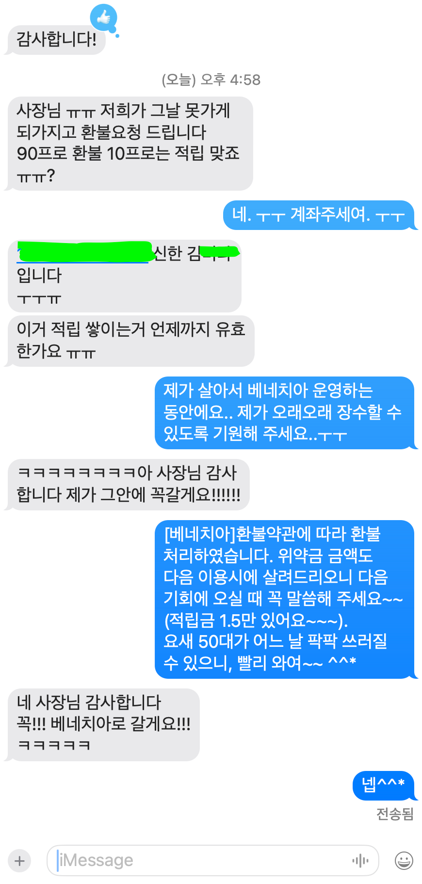 - 취소 환불 : 하루전까지는 무조건 90% 환불(10%는 적립), 이용 당일 나설 채비를 다 하셨는데, 비가 많이 와서 실망하실 경우에는 위로 차원으로 100% 환불합니다.(단, 당일 오전 10시 전에 문자주세요~ ). 그러니 하루전에 일기예보 때문에 100% 환불을 요구하지 말아주세요~ 적립된 10%는 베네치아가 사라지지 않고 영업하는 동안에는 계속 유효합니다. (5년전 적립금도 부활해서 쓰시는 분도 계십니다).